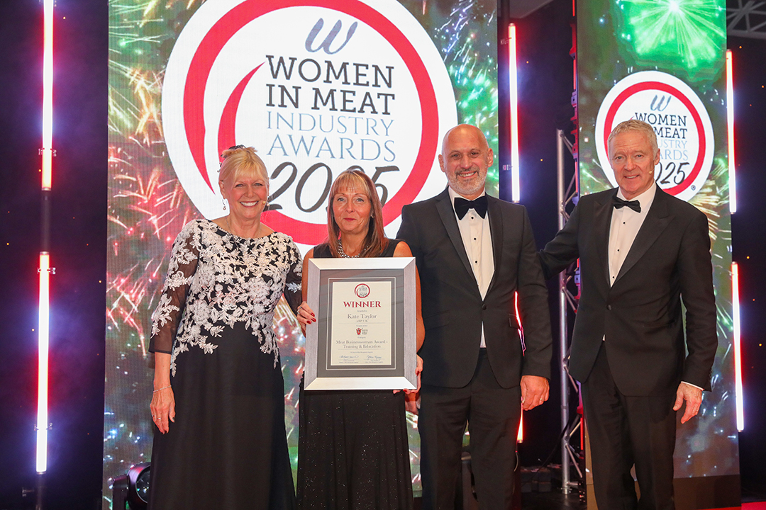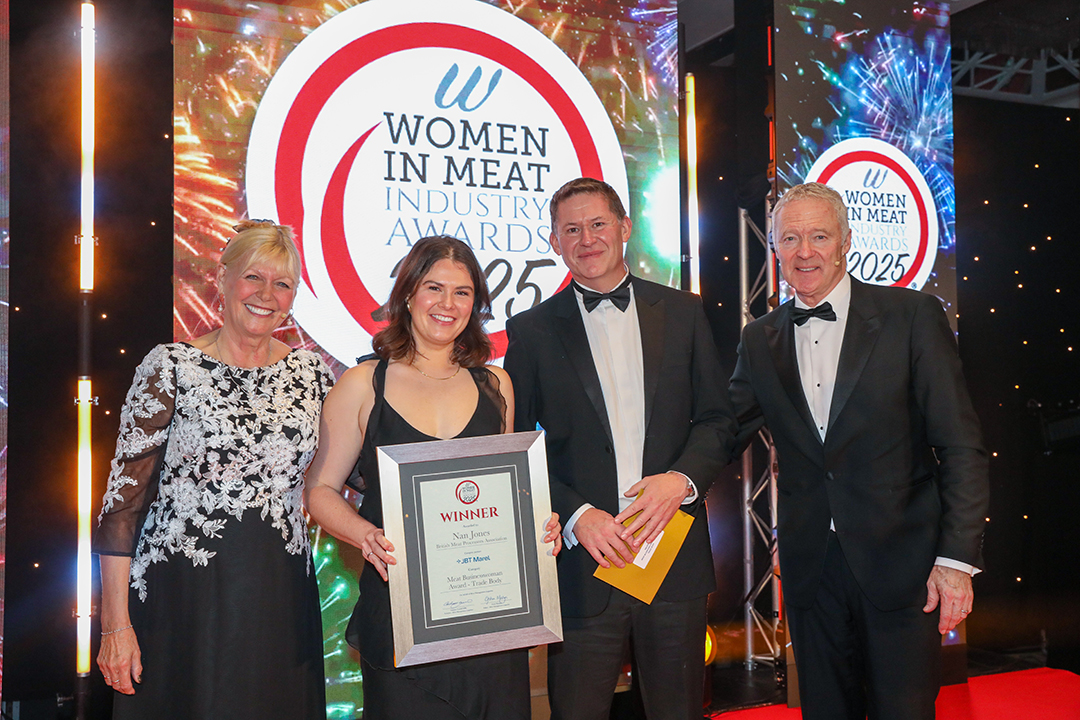 Meat Businesswoman Award – Training & Education: Winner – Kate Taylor, ABP UK. (L-R) Julie Peasgood, Lindsey Buckley of ABP UK (receiving the award on behalf of Kate Taylor), Dave Smith of category partner the Institute of Meat and Rory Bremner.