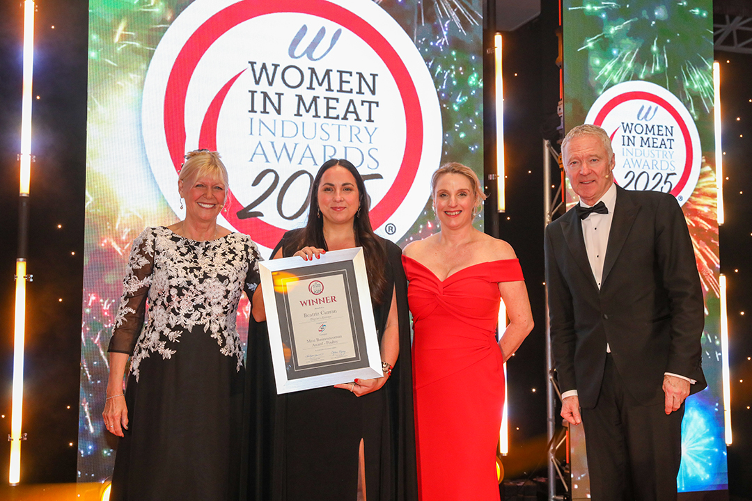 Meat Businesswoman Award – Poultry: Winner – Beatriz Curran, Pilgrim’s Europe. (L-R) Julie Peasgood, Beatriz Curran, Rebecca Harris of category partner Klöckner Pentaplast and Rory Bremner.