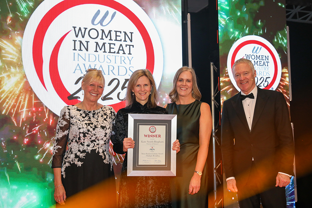 Meat Businesswoman Award – Multiple Retailing: Winner – Kate Smith-Bingham, Waitrose & Partners. (L-R) Julie Peasgood, Kate Smith-Bingham, Ashleigh Scarlett of category partner Pilgrim’s Europe and Rory Bremner.