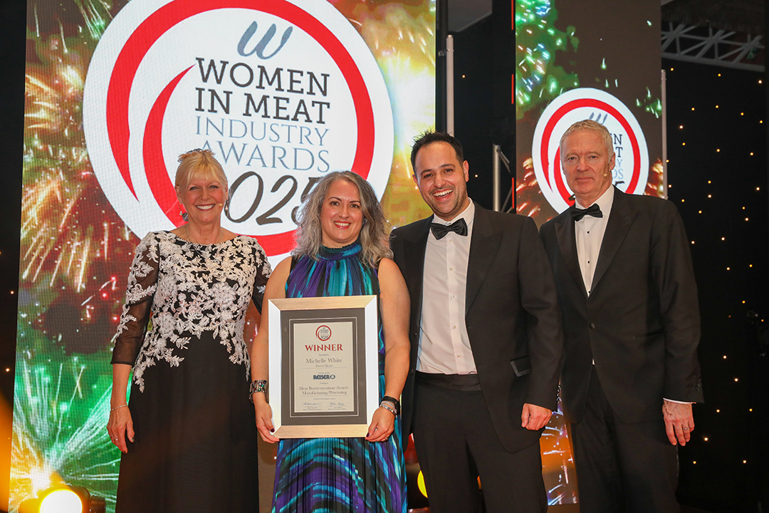 Meat Businesswoman Award – Manufacturing/Processing: Winner – Michelle White, Dawn Meats. (L-R) Julie Peasgood, Michelle White, Danny Kenworthy of category partner Reiser UK and Rory Bremner.